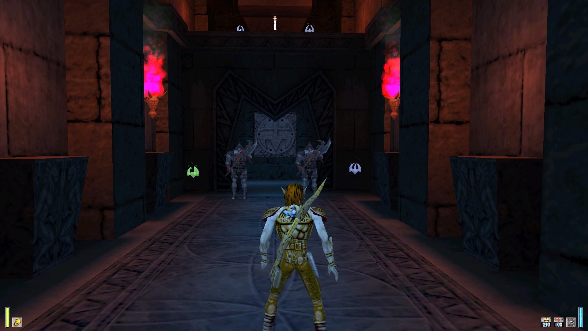 In Heretic II you play Corvus, the Elf who was exiled to the Outer Worlds but managed to find his way back home. Unfortunately, home is not the place it used to be: the land is beset by a dark magical plague and Corvus' brethren have mutated beyond recognition and have become insane with bloodlust. Enter Corvus, our hero.